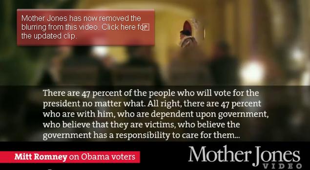 "무슨 일이 있어도 오바마에게 투표할 사람이 47%다. 이들은 정부에 의존적이며, 그들이 희생자라고 생각하며, 정부가 그들을 돌봐줘야 할 책임이 있다고 생각한다. 그들은 헬스 케어 및 음식, 주거 혜택을 받을 자격이 있다고 생각하며, 이 사람들은 소득세도 내지 않는다."(밋 롬니 후보)