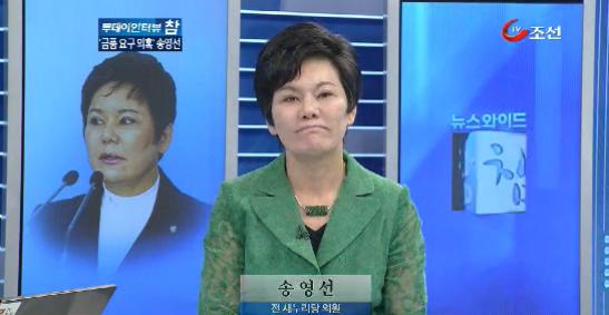 | ▲ 친박계 송영선 전 의원은 지난 20일 TV조선 <뉴스와이드 참>에 출연해 녹취록에 등장하는 사업가 ㄱ씨와의 일을 자세히 설명했다. 송 전 의원은 돈 요구를 시인하며 "나도 돈이 있었으면 몸부림이라도 한번 쳐봤을 것이라는 애석함 속에 나온 말"이라고 해명했다. ⓒTV조선 |