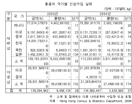 위의 경우는 재배삼을 얘기하는 것이고, 야생삼 분야로 가면 형편은 더욱 '무인지경'이다. 우리는 공식통계에 잡히지도 않을 정도로 전멸에 가깝기 때문이다. 같은 해 홍콩시장의 전체 수입량 가운데 99.9%인 2만7432kg이 미국으로부터의 수입이기 때문이다. 이를 액수로 보면 같은 해 미국이 홍콩에 수출한 재배삼 913만2000달러의 2배가 넘는 2120만4000달러나 된다.