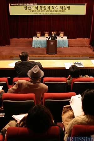 '제7의 당사자론'을 주장한 백 대표는 "관성적인 통일운동이나 교류협력을 통해 분단이 극복되리라거나, 아니면 분단을 그대로 둔 채 대한민국만이 평화와 번영을 누리고 '선진화'를 달성할 수 있다는 환상이 핵실험으로 인해 쇄신될 것"이라며 "접근을 통한 변화를 적극적으로 재해석해야 한다"고 강조했다.