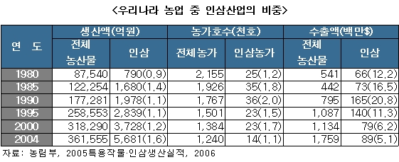 전체 농업에서 인삼이 차지하는 비중은 농가수나 생산액에 있어서는 1.1∼1.6%에 불과하지만 수출에서는 아직도 5% 수준을 유지하고 있다.