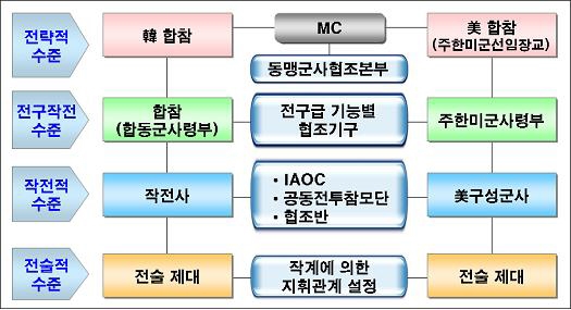 이행계획에는 양국 합참의 최고 협의기구인 군사위원회(MC)를 보좌하고 군사적인 측면의 동맹관리 및 협조체제강화를 위해 '동맹군사협조본부(AMCC)를 MC 산하에 두기로 했다. 또 한국 합참과 주한미군사령부 사이에 '전구급 기능별 협조기구'를 신설해 공동정보센터 등 6개의 기구를 상설 운영하며, 그 밑에 통합항공우주작전센터(IAOC)를 신설하는 한편 각 작전사별로도 협조기구를 만들기로 했다.