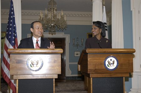 라이스 장관도 공동기자회견에서 한반도 평화체제 구축은 9.19공동성명에 명시된 내용으로 미국도 바라는 바라면서 "우리는 적절한 시기를 검토할 필요가 있으며 실질적인 북한 비핵화의 증거를 우리는 바란다"고 강조했다.