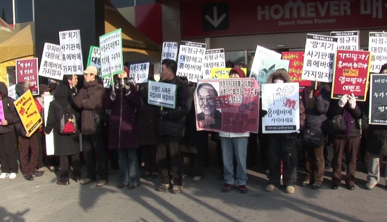 그런데 밖에서는 시위가 벌어지고 있습니다. 바로 이랜드노조 노동자들입니다.