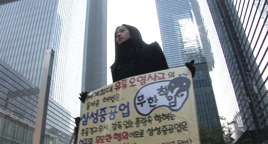 "언론에서 이 사건을 보도하는 데 있어서 중점이 흐려지고 삼성측의 주장을 일방적으로 싣고 있는 경우가 많아서 저희의 목소리를 언론을 통해서 시민들에게 알려야겠다는 생각이 들어서 이렇게 직접 거리로 나오게 되었습니다."