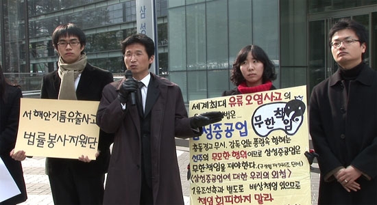 "서해안기름유출사고 법률봉사지원단은 여러 대학교의 법학 및 비법학 전공자들과 사법연수원생 등이 모여 지난 12월 28일에 발족한 자발적인 봉사단체로 삼성중공업의 이런 무책임한 태도를 보면서, 저희는 자원봉사 뿐만 아니라 삼성중공업에게 책임을 다하도록 촉구하는 행동에 나서지 않을 수 없습니다."