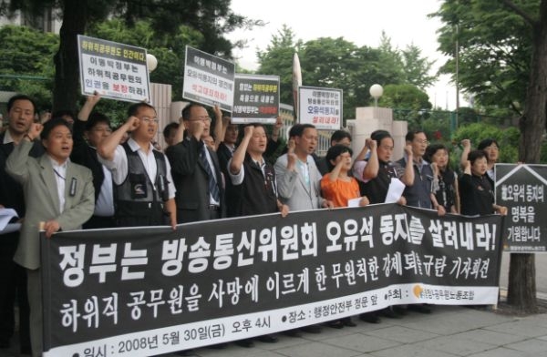 행정부공무원노동조합은 30일 서울 광화문 정부종합청사 앞에서 기자 회견을 갖고 "이번 사태는 정부의 주먹구구식 조직 개편과 공무원 강제 퇴출을 위한 재교육 프로그램을 강행하는 과정에서 발생한 인재이며 살인 사건"이라고 규탄했다.