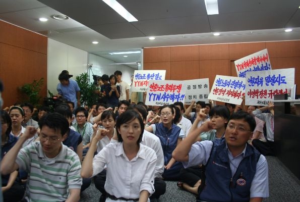 ▲ YTN 직원들을 사장실 지키기에 동원한데 대해 항의하는 YTN 노조원들. ⓒ프레시안