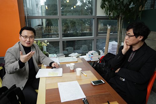 | ▲ 지난 21일 서울 마포 서교동 <프레시안>에서 오건호 글로벌정치경제연구소 연구실장과 정창수 후마니타스칼리지 교수(나라살림연구소장)가 박근혜 당선인의 복지 재정 조달 계획에 관해 대담을 하고 있다. 왼쪽이 정창수 교수, 오른쪽이 오건호 실장. ⓒ프레시안(최형락) |