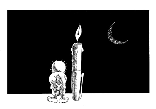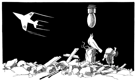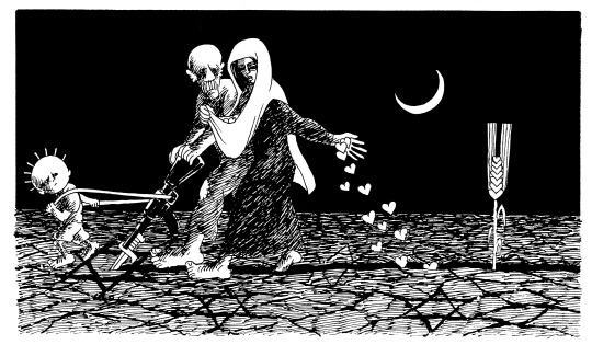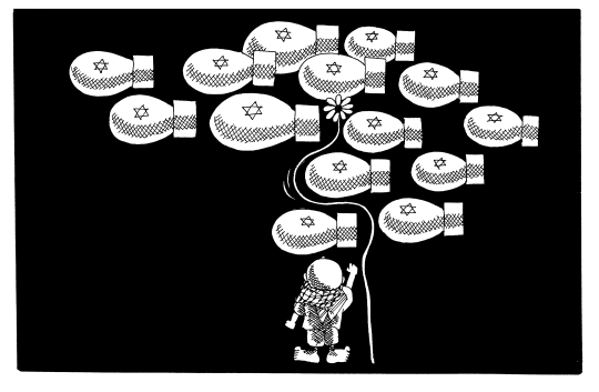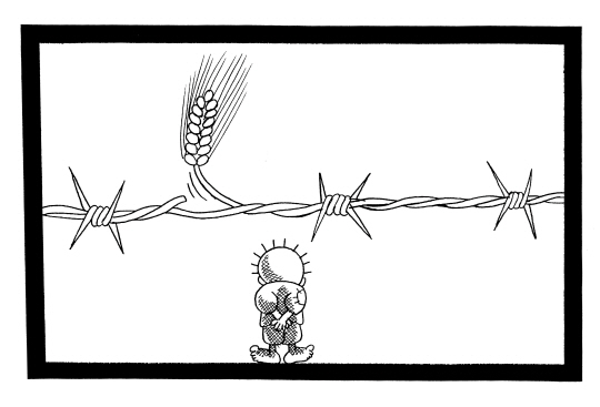 | 나지 알 알리의 그림에 가장 자주 등장하는 이미지는 꽃입니다. 꽃말이 '평화'인 데이지를 닮은 이 꽃은 몸이 누더기가 되어 죽어가는 슬픈 표정의 여자 아이가 들고 있는 꽃이며, 꼬마 한달라가 아름다운 팔레스타인 여인에게 바치는 꽃이 되기도 합니다. 또한 꽃이 피어 있는 돌밭에서 돌을 집어 드는 한달라의 행위는 팔레스타인 사람들이 평화를 얻기 위해 어떤 행동을 해야 하는지 말해줍니다. 또 하나의 이미지는 날카로운 철조망입니다. 지금은 가자지구의 유대인들이 철수했지만 당시 이스라엘은 유대인들을 보호한다는 명목으로 가자지구 40킬로미터를 철조망과 장벽으로 둘러쳤습니다. 라파 검문소로 상징되는 이 철조망은 모든 팔레스타인 사람들을 잠재적인 테러리스트로 몰았고, 거주와 이동의 자유를 박탈했습니다. 나지는 분단과 좌절의 상징으로 철조망을 그린 것입니다. 이러한 철조망 위해 독보리가 자라기도 합니다. 독보리는 성서에 등장하는 잡초인데 마태복음 13장 38절에 따르면 "악한 자의 자녀들"입니다. 따라서 독보리는 "지옥으로 가야 할" 것들이고, 레바논에 있는 파쇼적 성향의 기독교 집단을 가리킨다는 해석이 있습니다. 또한 독보리는 팔레스타인 지방에 지천인 잡풀 중 하나로 나지의 고향을 상징하기도 합니다. 이 독보리는 나지의 카툰에서 채찍으로 변해 팔레스타인 사람들을 억압하는 이미지로 표현됩니다. 나지의 그림에 자주 등장하는 또 하나의 이미지는 열쇠입니다. 열쇠는 난민촌에 쫓겨 온 그의 어머니가 집으로 돌아갈 수 있다는 희망으로 죽을 때까지 목에 걸고 있던 것입니다. 따라서 열쇠는 집을 잃어버린 모든 팔레스타인 사람들의 슬픔을 상징합니다. <편집자> |