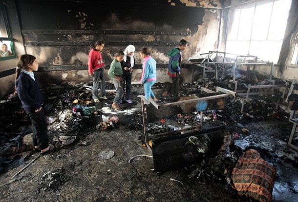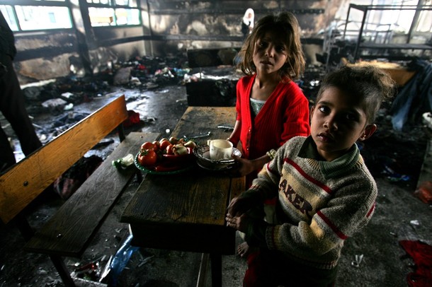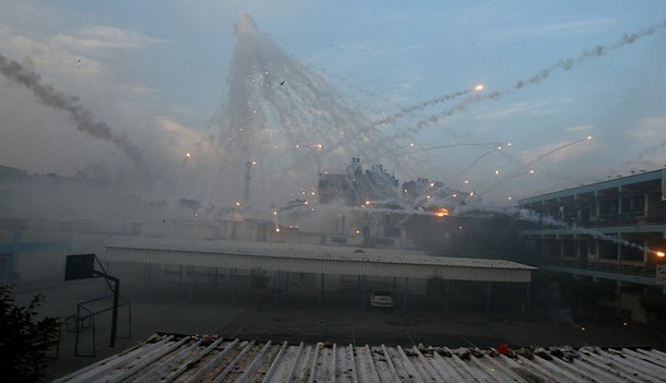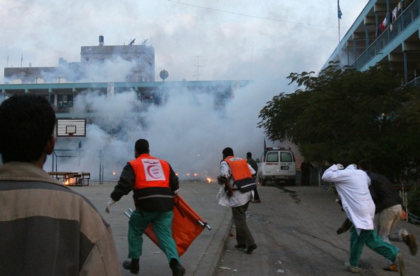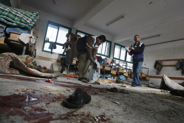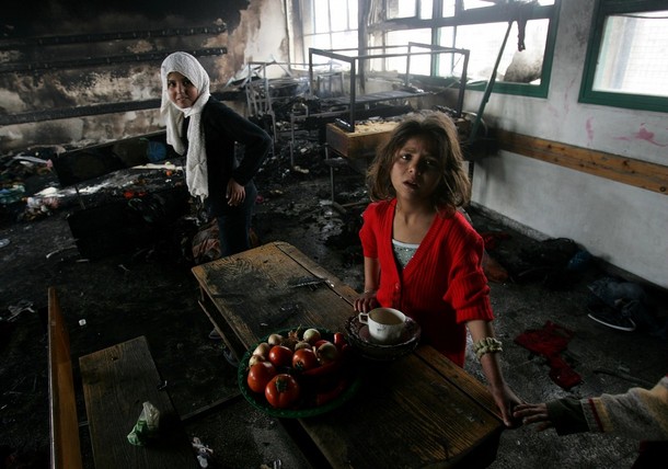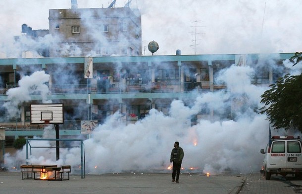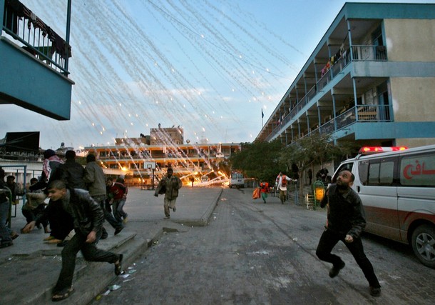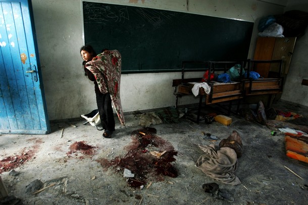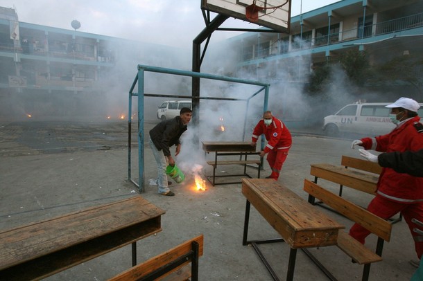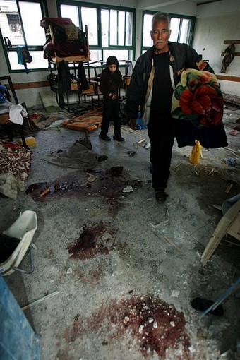 | 가까스로 포성이 멈춘 팔레스타인 가자 지구는 지옥의 모습 바로 그것이다. 22일간 자행된 이스라엘군의 무차별적인 폭격과 총격으로 도시는 잿더미가 됐다. 20일 현재 팔레스타인 측 사망자는 1310명 선으로 늘어났고, 부상자 수는 5500명 이상으로 파악되고 있다. 사망자 중 어린이만 460명이 넘는다. 또 다른 이스라엘 점령지 중 하나인 요르단강 서안(웨스트뱅크)에 살고 있는 모함마드 자카리야(시인)가 참사 현장 중 한 곳의 사진을 보내왔다. 지난 17일 이스라엘군이 가자지구 북족 베이트 라히아에 있는 유엔 학교를 공격하는 장면과 공격 후의 참상이 담긴 사진들이다. 가자지구에 있는 자카리야의 친구들이 목숨을 걸고 찍은 것들이다. 이날 공격으로 어린이 2명이 사망하고 다수의 부상자가 발생했다. 특히 이스라엘군은 이날 공습에서 민간인에 대한 사용이 금지된 백린탄을 쏟아 부었다. 가자지구에는 이러한 현장이 수십 곳에 이른다. <편집자> |