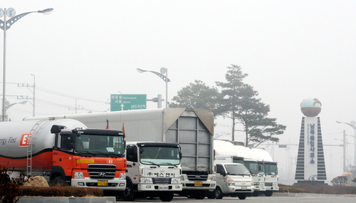 | ▲ LP가스와 식자재, 공사자재 등을 실은 트럭들이 17일 오전 경의선 남북출입사무소 주차장에서 출경을 기다리고 있다. ⓒ연합뉴스 |