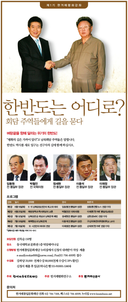 강의는 매주 목요일 저녁 7시부터 2시간 동안 동국대 문화관 1층 덕암세미나실에서 열린다. 수강을 원하는 사람은 한겨레통일문화재단 홈페이지에서 신청서를 내려받아 제출하면 되고, 선착순 150명만 수강이 가능하다.