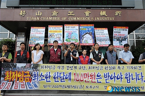민주노총, 한국노총 등 30여개 단체가 모인 최저임금연대는 2010년 최저임금을 2008년 노동자 평균임금의 50%인 시급 5150원(월 107만6350)원을 요구하고 있다.