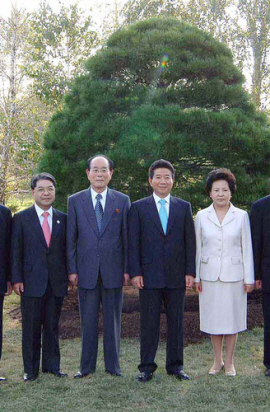 | ▲ 제2차 남북 정상회담 일정 마지막날이었던 2007년 7월 4일 평양식물원에서 노무현 대통령 내외, 김영남 북한 최고인민회의 상임위원장과 기념촬영을 한 이재정 통일부 장관(맨 왼쪽) ⓒ연합뉴스 |