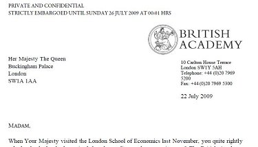 영국 학사원(BA)의 팀 베슬리와 피터 헤네시 교수가 학사원을 대표해 보낸 이 서한은, 최고 권위의 학술협회인 BA 등 각계 전문가들이 모인 토론회에서 여왕이 하문한 금융위기 예측 실패의 원인에 대한 견해들을 정리한 것이다.