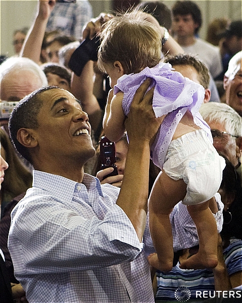 | ▲ 버락 오바마 대통령이 지난 14일 의료보험 개혁에 대한 설명회에서 한 아기를 들어보고 있다. ⓒ로이터=뉴시스 |