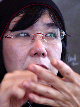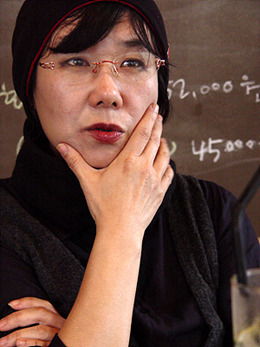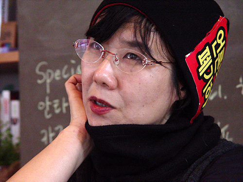 | ▲ <정크노트>, <이로니, 이디시>의 작가 명지현 씨. 최상재 위원장의 부인이기도 한 그는 이날 '언론악법 폐기하라'는 스티커가 붙은 검은 니트모자를 쓰고 왔다. ⓒ프레시안 |