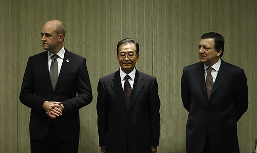 | ▲ 30일 중국 장쑤성 난징에서 열린 EU-중국 정상회의 기자회견에 주제 마누엘 바로수(오른쪽) EU 집행위원장과 원자바오(가운데) 중국 총리, 프레드릭 라인펠트 스웨덴 총리가 참석하고 있다. ⓒ연합뉴스 |