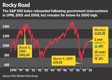 지난 8일 10552.52로 마감한 다우존스의 최고점은 지난 2007년 10월에 기록한 14164.53이다. 문제는 다우존스 지수가 1년 사이에 61%나 올랐는데, 앞으로도 증시가 강세장을 이어갈 것인지, 아니면 약세장으로 전환할 것인지에 대한 장기적 전망을 두고 권위 있는 전문가들이 정반대의 주장을 펴고 있다는 점이다.