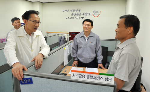 | ▲ 이명박 대통령이 지난 7월 22일 강서구 화곡동 포스코 미소금융지점을 방문해 현장 직원들과 이야기를 나누고 있다. ⓒ연합뉴스 |