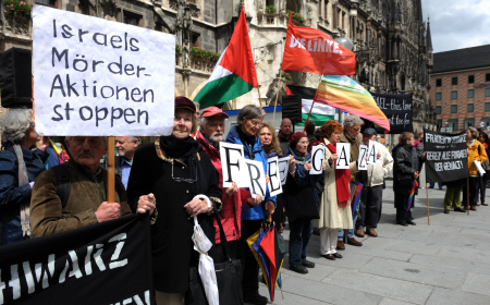 | ▲ 독일의 시민단체 회원들이 이스라엘의 살인적인 악행을 중단할 것을 촉구하는 시위를 벌이고 있다. ⓒ로이터=뉴시스 |