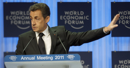 | ▲ 니콜라 사르코지 프랑스 대통령 27일 다보스 포럼에서 유로화에 대한 강력한 방어 의지와 글로벌 금융개혁 등에 대해 연설하고 있다. ⓒAP=연합 |