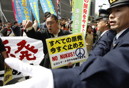 | ▲ 후쿠시마 원전운영업체 도쿄전력 본사 앞에서 시민들이 후쿠시마 원전 사태에 대해 격렬하게 항의하고 있다. ⓒ로이터=뉴시스 |