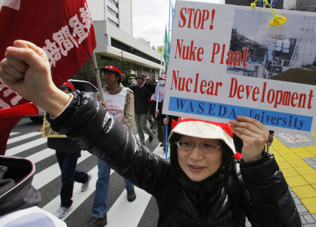 | ▲ 도쿄가 있는 수도권 원전 일대에 지진이 발생할 가능성이 제기되면서 도쿄 시민들이 지난 10일 원전 가동과 건설 중단을 요구하는 시위를 벌이고 있다. ⓒAP=연합 |
