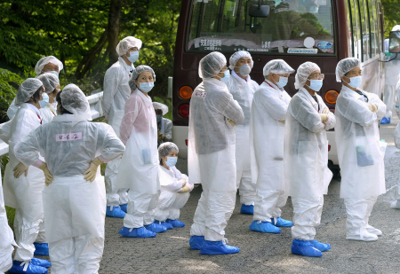 | ▲ 지난 4일 후쿠시마 주민들이 방사능 방호복을 입은 채 집단 이동을 위해 기다리고 있다. 후쿠시마에서는 원전 일대 토양은 물론, 지하수와 바닷물에서 '악마의 재'라는 스트론튬까지 검출됐다. ⓒAP=연합 |