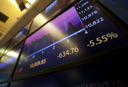 이날 뉴욕증권거래소(NYSE)에서 다우지수는 지난주 종가보다 무려 634.76포인트(5.55%) 하락한 1만809.85에서 거래를 마쳤다. 사상 6번째 폭락세다. 다우지수는 지난 2일 심리적 저지선이라는 1만2000선이 붕괴된 지 4 거래일 만에 '검은 목요일'에 이어 '검은 월요일'이 잇따르면서 1만1000선마저 무너져 내렸다.