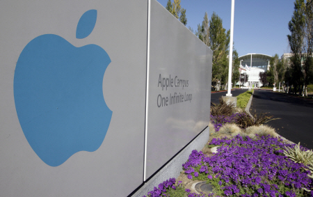 ▲ 스티브 잡스의 사임 소식이 전해진 직후 캘리포니아 쿠페리노에 있는 애플 본사 입구의 모습. '잡스 없는 애플'은 지속적인 성공기업이 될 수 있느냐에 의문이 커지고 있다. ⓒAP=연합