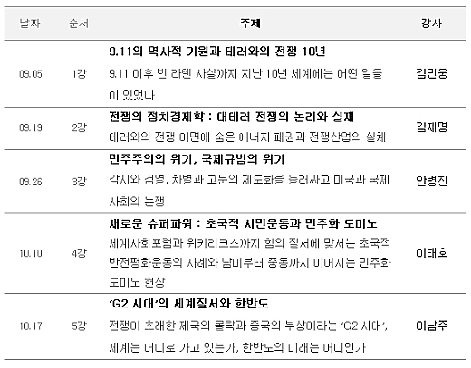 강사로는 김민웅 성공회대 NGO대학원 교수, 김재명 성공회대 교양학부 교수, 안병진 경희사이버대 미국학과 교수, 이태호 참여연대 사무처장, 이남주 성공회대 중국학과 교수가 참여합니다.