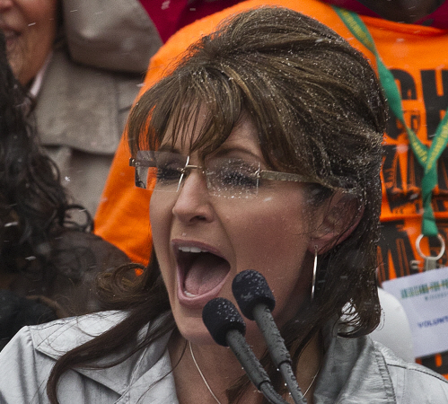 | ▲ 세라 페일린 전 알래스카 주지사가 지난 4월 눈보라가 몰아치는 위스콘신주 매디슨을 찾아 공무원 노조를 비난하는 연설을 하고 있다. ⓒAP=연합뉴스 |