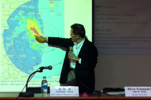 | ▲ 가와사키 아키라(川崎哲) '피스보트' 공동대표가 2일 참여연대 등이 주최한 국제 군축 워크숍에 참석해 후쿠시마(福島) 원전 일대의 방사능 위험에 대해 설명하고 있다. ⓒ프레시안(곽재훈) |