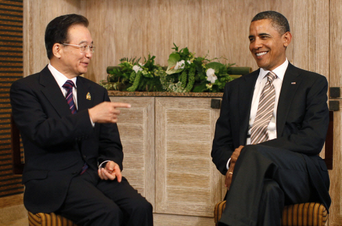 | ▲19일 인도네시아 발리에서 예정에 없던 전격 회동을 가진 버락 오바마 미국 대통령과 원자바오(溫家寶) 중국 총리. ⓒ로이터=뉴시스 |