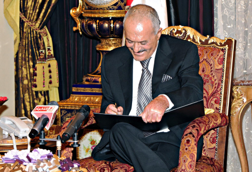 | ▲알리 압둘라 살레 예멘 대통령이 23일(현지시간) 사우디아라비아 리야드에서 자신의 퇴임과 부통령으로의 권력 이양을 골자로 하는 걸프협력회의(GCC) 중재안에 서명하고 있다. ⓒAP=연합뉴스 |