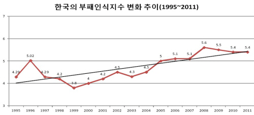 한국은 1999년 3.8점에서 지속적으로 청렴도가 개선되는 추세를 보여 2008년 5.6점을 기록했으나 2009년에는 5.5점, 2010년에는 5.4점으로 하락했다.