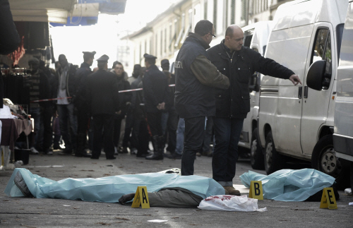 | ▲13일(현지시간) 이탈리아 피렌체에서 극우단체 회원 쟌루카 카세리(50)에 의해 살해된 세네갈 출신 노점상들의 시신. ⓒ로이터=뉴시스 |