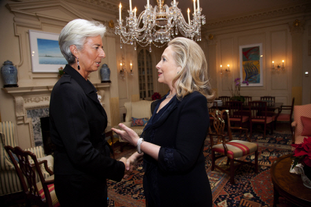 | ▲ 크리스틴 라가르드 IMF 총재가 15일(현지시간) 미 국무부에서 힐러리 클린턴 국무장관을 만나고 있다. 이어 라가르드는 "글로벌 경제가 30년대식의 경제위기로 가고 있다"고 경고하는 연설을 했다. ⓒAP=연합 |