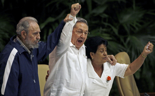 | ▲지난 4월 쿠바공산당 제1서기로 취임한 라울 카스트로 국가평의회 의장(가운데)이 이끄는 쿠바 정부는 일련의 경제 개혁 조치들을 추진하고 있다. 사진 왼쪽은 그의 전임자이자 친형인 피델 카스트로. ⓒAP=연합뉴스 |