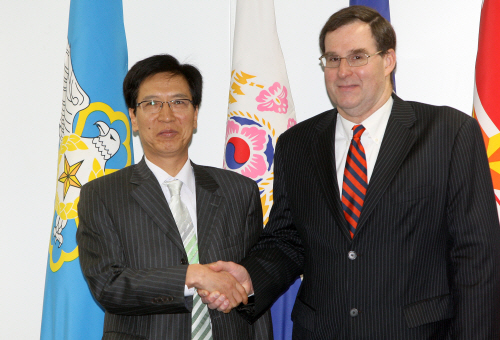 | ▲2008년 4월 8일 17차 한미 안보정책구상(SPI) 시작에 앞서 전제국 국방부 국방정책실장과 데이비드 세드니 미 국방부 동아태담당 차관보가 악수하고 있다. ⓒ사진공동취재단=뉴시스 |