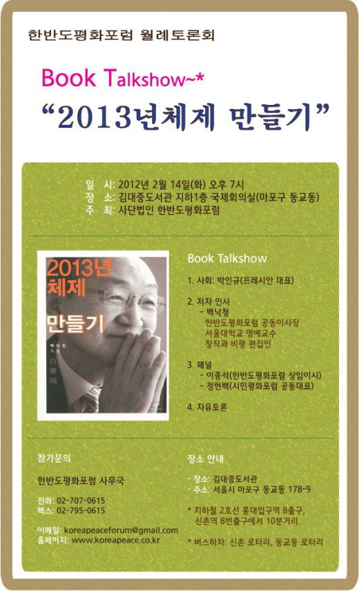 사단법인 한반도평화포럼(공동이사장 임동원·백낙청)은 오는 14일(화) 오후 7시 서울 동교동 김대중도서관에서 백낙청 교수의 최근 저서 <2013년 체제 만들기>를 바탕으로 한 '북 토크 쇼'를 개최한다고 밝혔다.