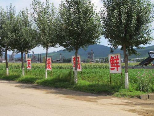 | ▲원정리-라진 도로건설 현장에 붙은 중국어 표지판. '조선(북한)을 지원한다'(支援朝鮮)라는 구호다. ⓒ일본 동북아경제연구원(ERINA) |