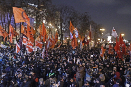 | ▲ 5일(현지시각) 모스크바에서 2만 여명이 모여 푸틴의 퇴진을 요구하는 대규모 시위를 벌였다. ⓒAP=연합 |