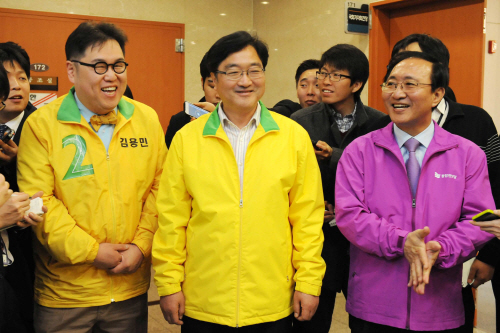 | ▲4.11 총선에서 서울 노원갑에 출마한 민주당 김용민 후보, 노원을의 우원식 후보, 노원병의 노회찬 통합진보당 후보(왼쪽부터)가 22일 국회 기자회견장을 나서며 기자들의 질문에 답하고 있다. ⓒ뉴시스 |