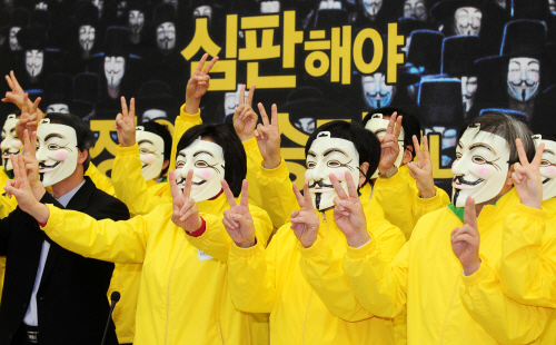 위원들은 미리 준비한 구호에 맞춰 손가락으로 'V'자를 그리는 몸짓까지 선보였다. 사진기자들의 플래시가 쏟아진 것은 당연했다. MB심판위 위원장을 맡은 박영선 의원이 가장 먼저 가면을 벗고 인사에 나섰다. 박 위원장은 가면에 대해 "MB·새누리의 거짓과 위선을 심판을 통해 벗겨내고자" 하는 의미라며 "그들만을 위한 권력을 향유하는 위선의 가면을 벗겨내야 한다"고 설명했다.