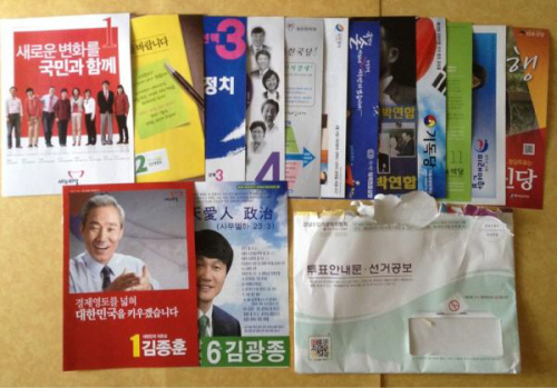 | ▲한 트위터 이용자가 제보한 선거공보물 사진. 민주통합당 정동영 후보의 지역구 공보물만 빠져 있다. ⓒ정동영 선대위 |