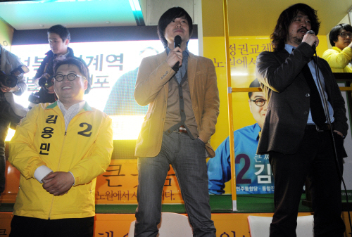 | ▲지난 9일 서울 노원갑 지역구의 김용민 민주통합당 후보 유세현장을 찾은 <나꼼수> 멤버들. 앞줄 왼쪽부터 김 후보, 주진우 <시사인> 기자, 김어준 <딴지일보> 총수. ⓒ뉴시스 |