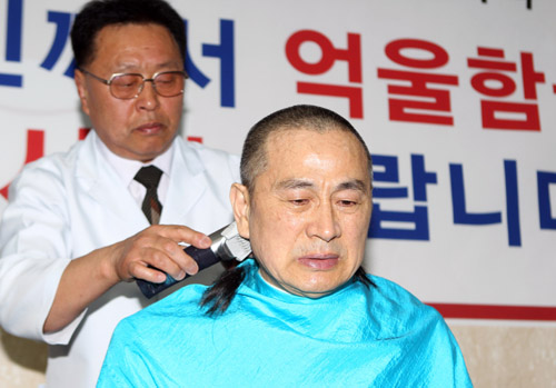 | ▲지난달 14일 자신에 대한 제기된 의혹에 대해 억울함을 호소하며 삭발식을 하고 있는 유재중 당선자(부산 수영). ⓒ연합뉴스 |